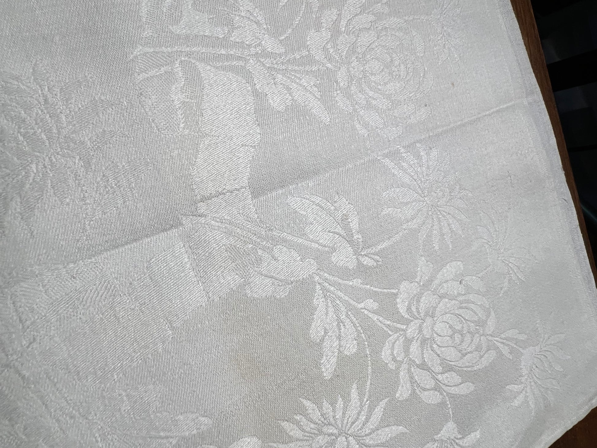 This beautiful set of eight vintage napkins perfectly complements the matching rose tablecloth, featuring the same classic floral charm and timeless design. 🌺 Each napkin measures 25" x 11", crafted with care and elegance that reflects the fine quality of vintage linens. The set shows some light staining consistent with age and gentle use, adding authentic character without diminishing its beauty. ✨ Ideal for collectors or anyone who loves romantic, vintage-style dining, these napkins bring warmth, history, and graceful charm to any table setting. 🍽️💐 Matches tablecloth #TC105